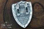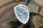 The reverse side is designed to resemble a wooden shield with metal fastenings and eyelets for a secure chain attachment. A decorative inscription and detailed elements add a finished look and uniqueness to the piece on both sides.