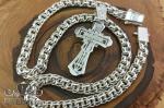 Статусный набор из серебра 925 пробы включает массивную цепь плетения Бисмарк и выразительный нательный крест. Общая композиция формирует цельный, брутальный образ с акцентом на объем и детализацию.