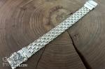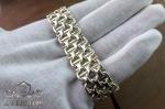 Данное плетение отличается высокой плотностью и многослойной геометрией: звенья с характерными перекрестными элементами дополнены гладкими пластинами, создающими ритмичный рисунок и усиленную прочность конструкции. Полированная поверхность без покрытия раскрывает естественный блеск серебра и четкость форм.