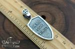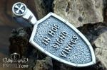 На обратной стороне размещена надпись IHS SIGNO VINCES — христианский символ победы веры и духовной опоры. Рельефный текст гармонично сочетается с зернистой фактурой фона и рамкой, стилизованной под укреплённый щит с декоративными заклёпками. Ушко украшено крестом и выполнено в единой стилистике изделия.